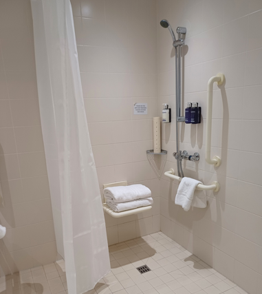 Each en-suite bathroom in the accessible room is step-free and features a walk-in shower, a low-mounted sink, a toilet seat designed for guests with disabilities, and support rails.